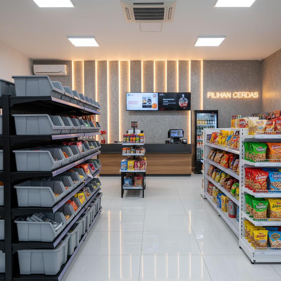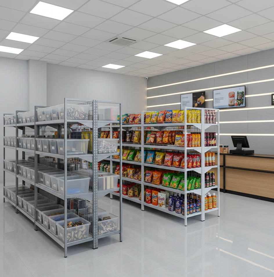 Kami menyediakan beragam jenis rak — mulai dari rak besi siku, rak gondola minimarket, meja kasir, hingga backwall — yang dapat disesuaikan dengan ukuran dan kebutuhan ruang usaha Anda.